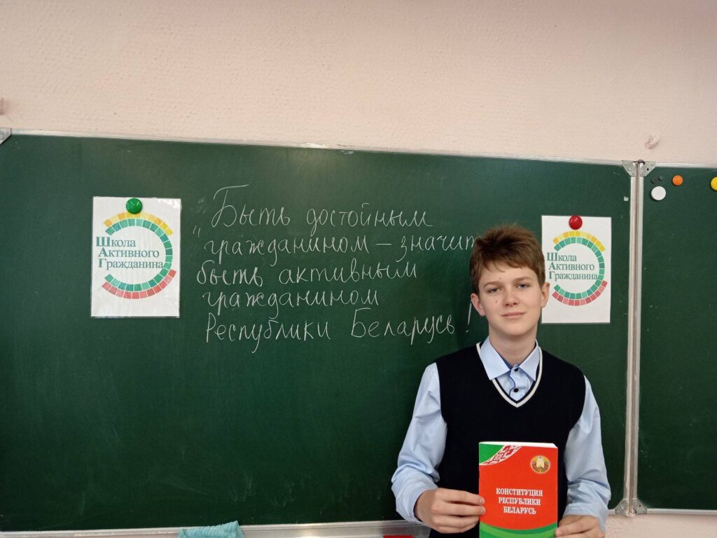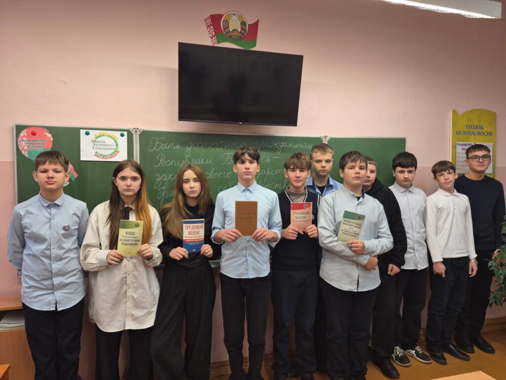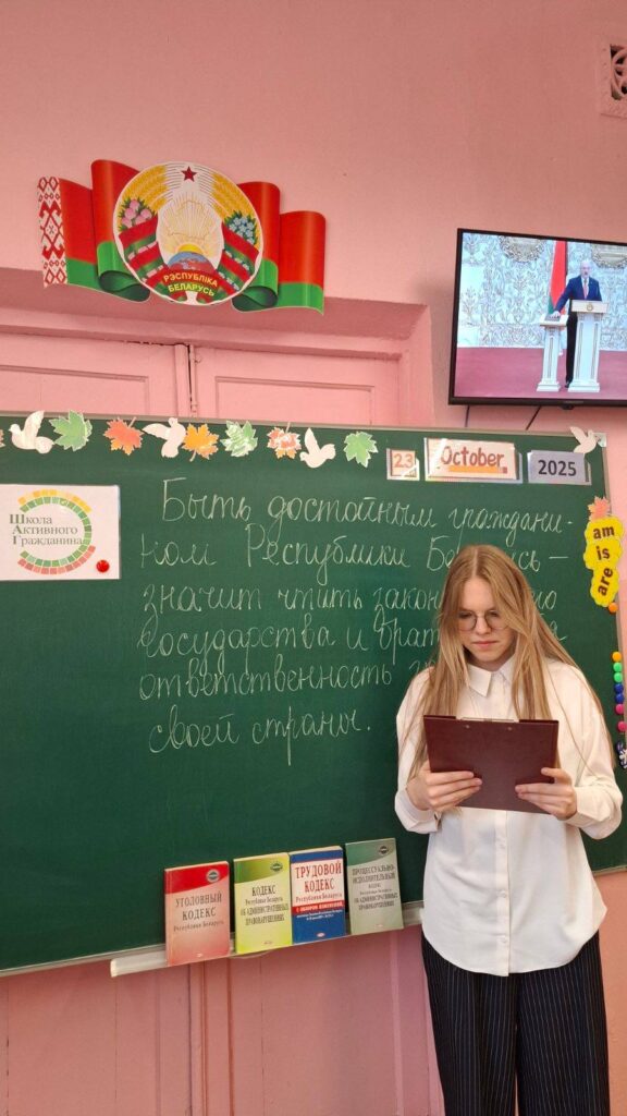 В рамках реализации информационно-образовательного проекта “ШАГ” 23.10.2025 в 8х классах ГУО “Средняя школа №25 г.Гомеля имени Б.А.Царикова” состоялось занятие “Быть достойным гражданином Республики Беларусь – значит чтить законы своего государства и брать на себя ответственность за будущее своей страны”. Ребята имели возможность углубить знания об изменениях и дополнениях в Конституции Республики Беларусь по результатам референдума 2022 года, о правах и обязанностях Президента Республики Беларусь, о полномочиях Всебелорусского народного собрания, о ветвях государственной власти и о том, за что награждают государственными наградами и премиями.