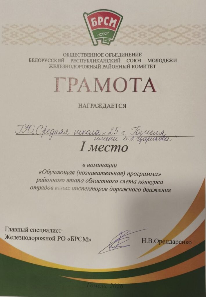 17 апреля команда юных инспекторов движения ГУО “Средняя школа №25 г. Гомеля имени Б.А. Царикова” представила школу на районном этапе слёта ЮИД. Ребята продемонстрировали высокий уровень подготовки, сплочённость и отличные знания в различных дисциплинах.